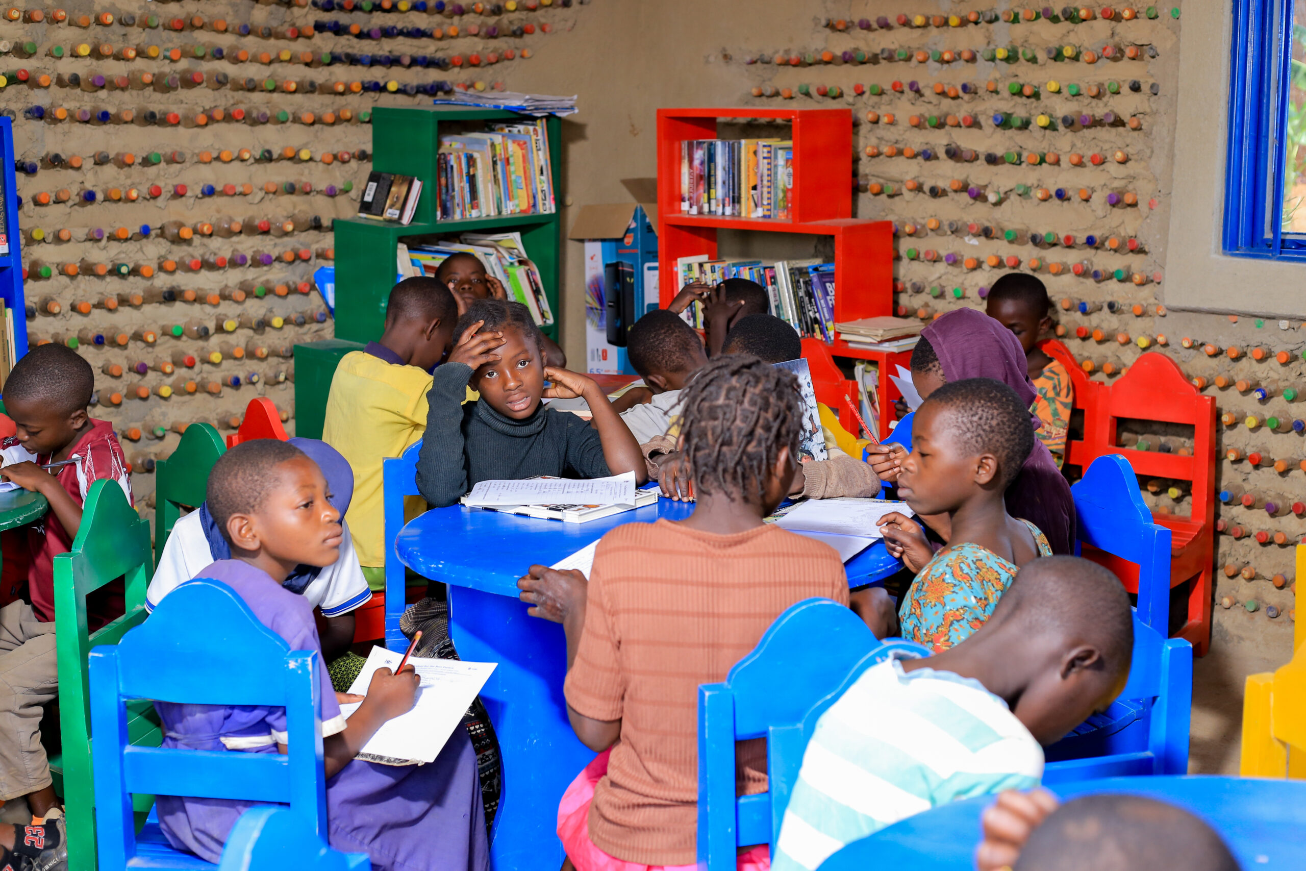 We are constructing a library from recycled plastic bottles, stocked with 900+ books, offering a quiet space for reading, learning and group discussions.